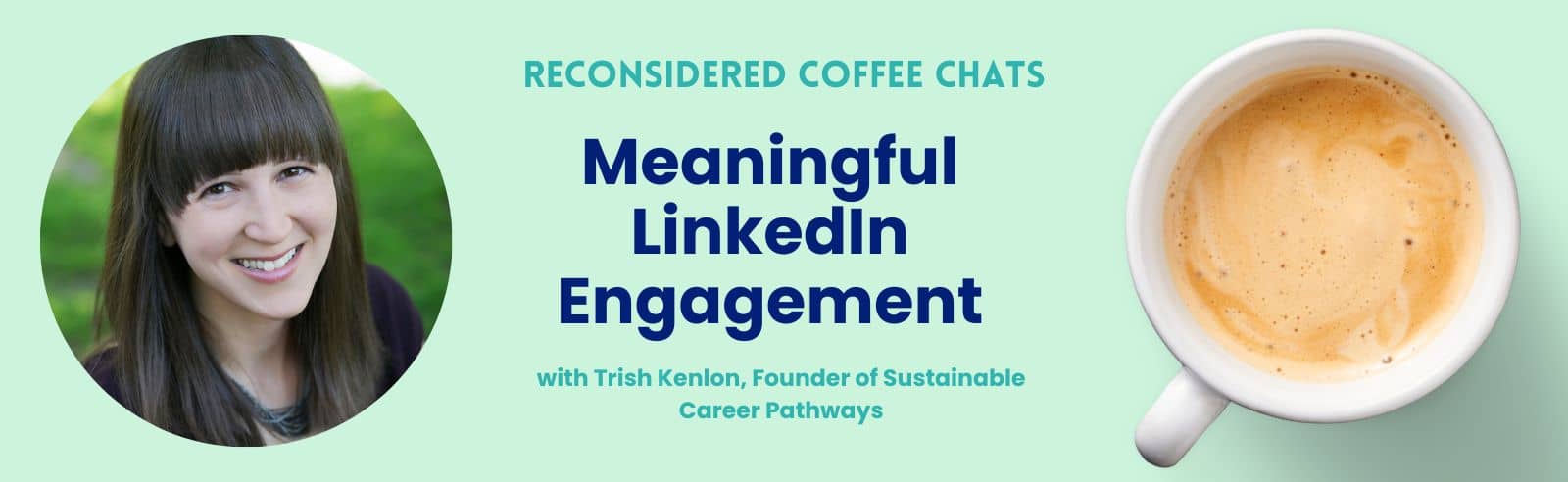 Don't forget to register for Reconsidered's next Coffee Chat! Our popular virtual networking series is back on July 30th and co-hosted by Sustainable Career Pathways' Trish Kenlon. We'll be diving into Meaningful LinkedIn Engagement with a quick "wisdom drop" from Trish, followed by breakout rooms with fellow sustainability and social impact professionals. Registration is required to attend so sign up now to book your spot (they fill up fast)!